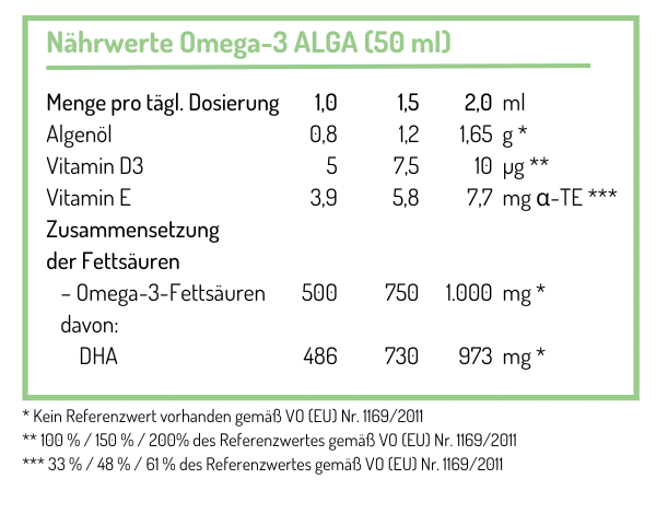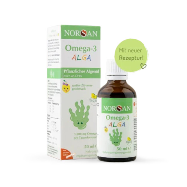 Das NORSAN Omega-3 ALGA enthält ein pflanzliches Algenöl, welches reich an der marinen Omega-3-Fettsäure DHA ist. Es wurde besonders auf die Bedürfnisse von Kindern abgestimmt und ist dank des kindgerechten Dosierlöffels leicht zu dosieren. Die empfohlene Tagesdosis (bspw. 2 ml bei 35 kg) enthält 1.000 mg Omega-3.